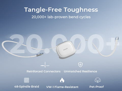 This innovative usb c fast charger cable extends from 0.1m (compact) to 1.2m (extended) for flexible use at home, office, or travel. Features dual-pull design: Pull either one end or both ends to extend. To retract: Always hold BOTH ends and gently pull together⚠️ Safety Warning: Releasing one end during retraction may cause the free end to snap back at high speed, potentially causing injury