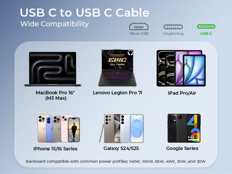 Experience lightning-fast power with our 240W USB C to USB C cable, featuring PD 3.2 technology for up to 48V/5A output—perfect for high-performance laptops, workstations, and fast-charging devices. ( Note: Actual charging speed depends on your device and charger.) Backward compatible with common power profiles: 140W, 100W, 65W, 45W, 30W, and 20W