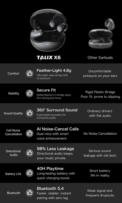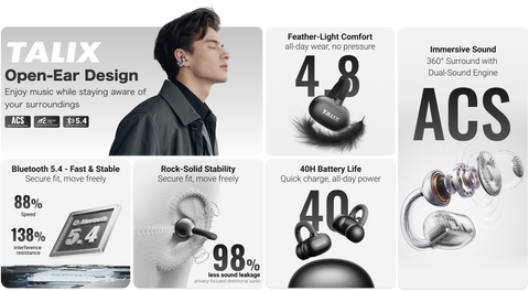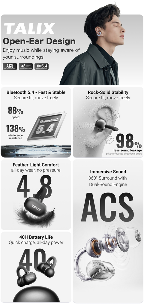 Open-Ear Design · Leak-Proof Sound for Safer, Natural Listening
